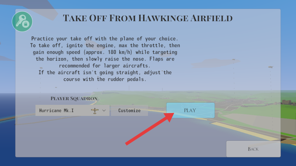 3、阅读任务说明后,点击蓝色【PLAY】按钮,开始练习飞机起飞操作。
