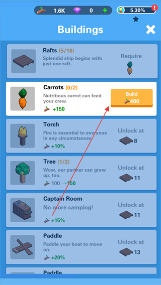 2、进入Buildings界面,点击Carrots对应的Build,消耗400资源建造胡萝卜设施。