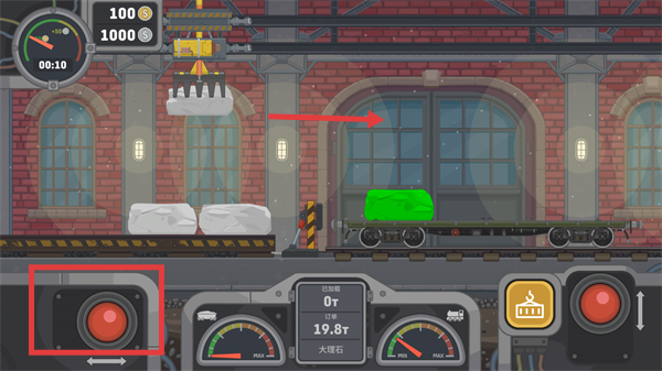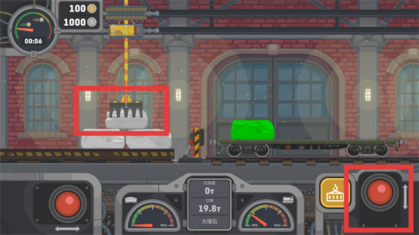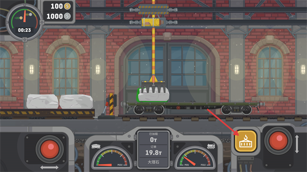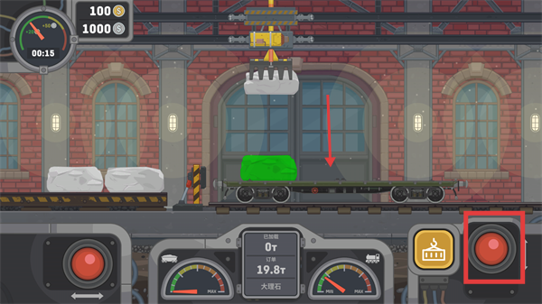 3、点击右侧【控制按钮】,控制起重设备下降,将矿石精准放置到【货车】的车厢内。