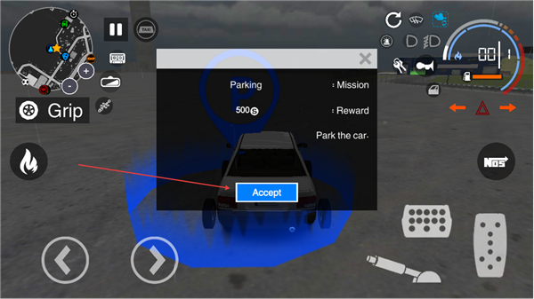 4、点击Accept接受停车任务,将车辆停入指定区域,完成后获取500奖励。