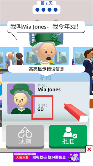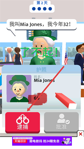 4、点击红色的逮捕按钮,对使用假护照的旅客执行处置。