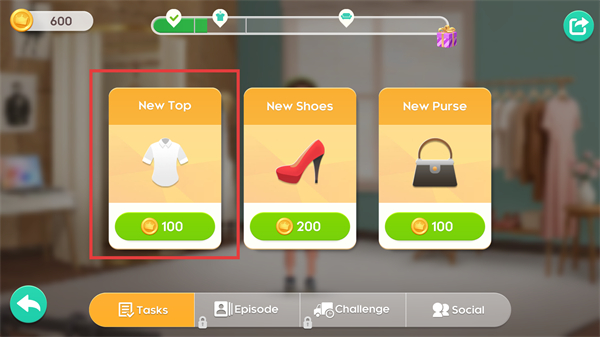1、花费100金币购买【NewTop】,为角色搭配基础上衣,顺利推进换装流程。