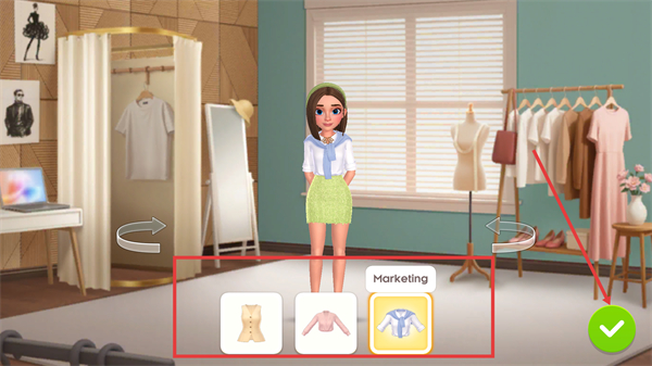 2、在换装界面选择标有【Marketing】的上衣,点击右侧绿色对勾确认搭配,完成上衣更换。