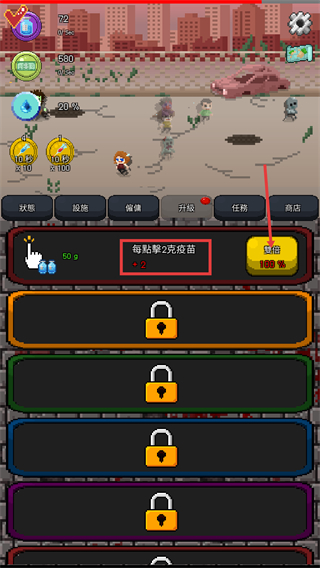 3、在【升級】界面中,利用【每點擊2克疫苗-+2】的机制获取疫苗,还可点击【雙倍-100%】按钮提升获取效率。