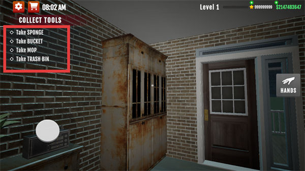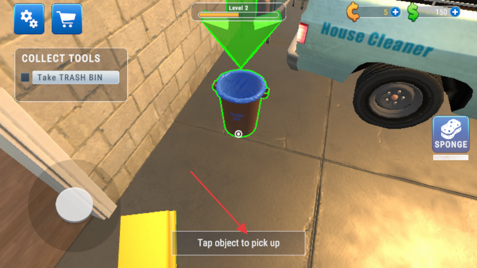4、找到垃圾桶后,依据的提示拾取,完成所有工具收集,助力完成Level2的清洁任务。