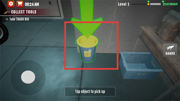 4、移动到目标位置找到垃圾桶,点击拾取后完成当前关卡的工具收集任务。