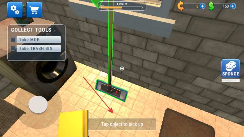 3、看到拖把时,按照提示拾取,完成后继续收集【TRASHBIN】,推进Level2的进度。