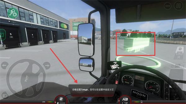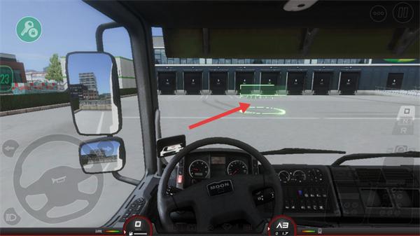 3、观察后视镜确认车辆位置,驾驶卡车驶向场景中的绿色目标区域,完成定位。