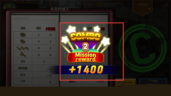 4、完成订单达成【COMBO2】后,会弹出任务奖励界面,可获得【+1400】的额外收入。