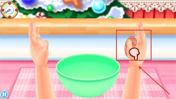 2、将手中的【肉球】点击左手,到右手上,完成食材的初步投放步骤。
