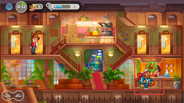 3、观察场景中的多个任务区域,依次完成房间清理与客人需求对接,积累足够钥匙即可达成当前关卡目标。