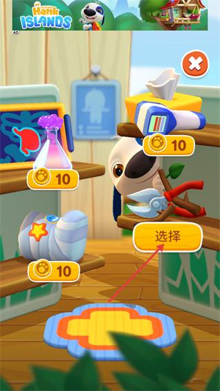 4、进入道具选择界面,点击【选择】按钮获取对应道具(消耗10货币),用于互动或装饰场景。