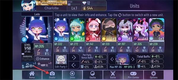 1、在【Units】界面查看角色的【HP】【Level】等信息,点击角色可进行【Enhance】等养成操作。