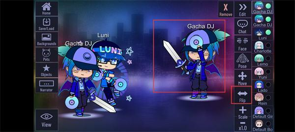 3、选中场景中的【Gacha-DJ】角色,点击右侧【Flip】功能,可翻转角色的朝向改变展示效果。