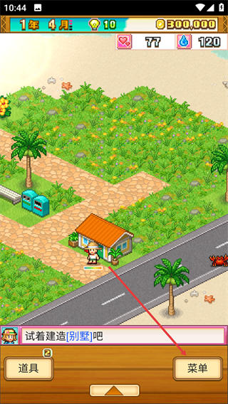1、界面提示“试着建造[别墅]吧”,点击底部【菜单】按钮,可打开功能列表,进而选择建造相关的操作选项。