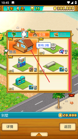 3、在设施建造界面,选择【别墅】类设施(如旅店),查看其影响范围与所需资源,确认后可进行建造操作。