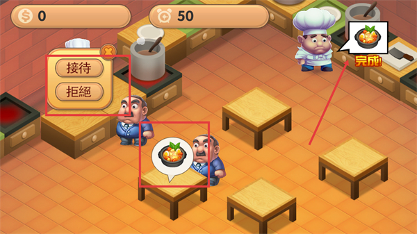 1、顾客进店后,优先点击【接待】按钮接收订单,按提示完成【炖菜】制作,可快速提升经营进度并积累初始金币。