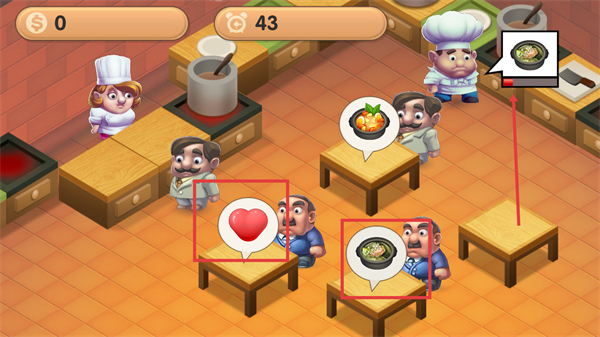 2、关注顾客头顶的【爱心】标识,及时完成【绿色炖菜】订单,维持顾客满意度以避免经营评分下降影响收益。