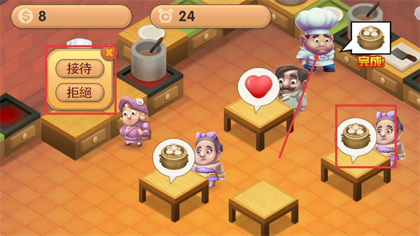 3、新顾客进店时选择【接待】,处理【蒸饺】类订单,完成后可触发【完成】提示获取额外经营奖励。