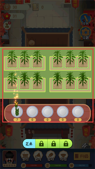 3、在种植界面收获成熟的【食材】,填充到底部盘子中,积累食材用于后续经营。