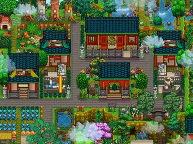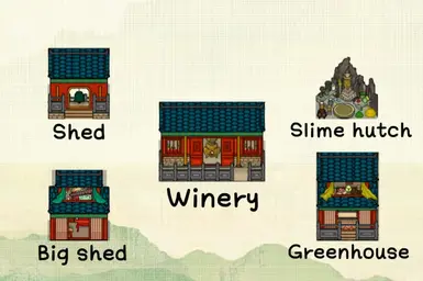 1、农场建筑美化,采用中国道教风格,包括温室、酒厂、黏液屋和两座小屋美化。建筑风格灵感来自游戏《江南百战图》。