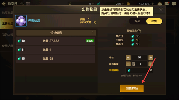 4、设置出售单价和数量后,点击【出售物品】,完成物品出售。