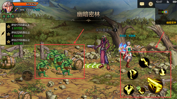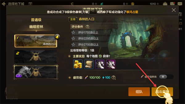 1、选择【森林的入口】地下城,点击【战斗开始】,进入幽暗密林战斗场景。