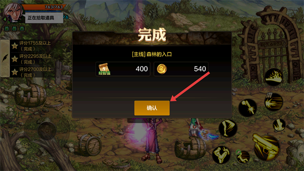 4、战斗完成后,点击【确认】,领取经验值和金币奖励。