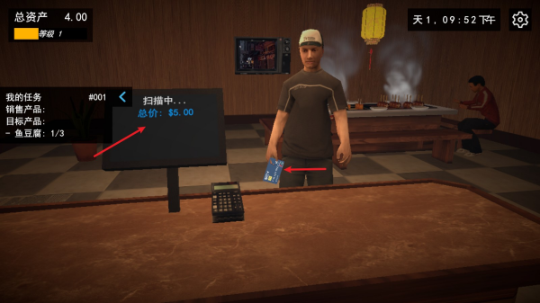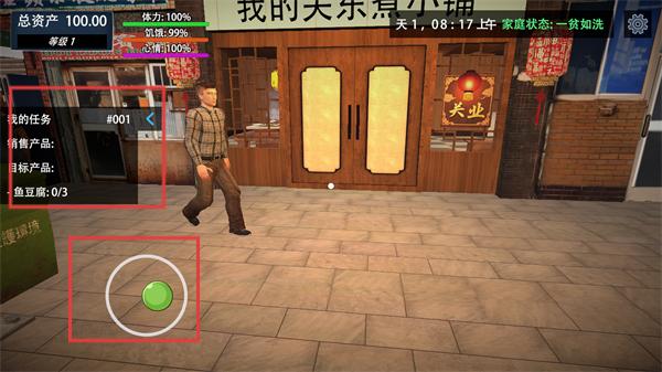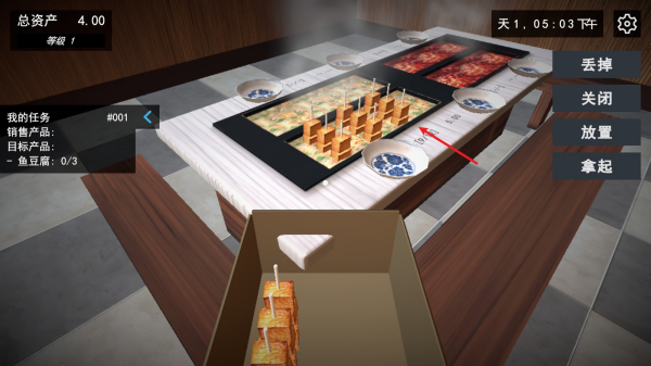 2、进入店铺场景后,查看左侧【我的任务】(如销售鱼豆腐0/3),点击绿色按钮推进流程。
