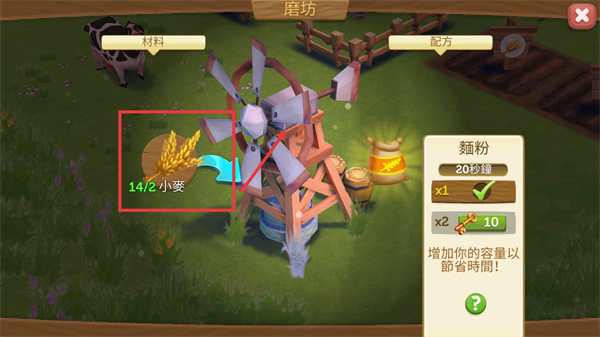 4、磨坊加工完成后,点击顶部产出的【小麦粉】,用于订单提交。