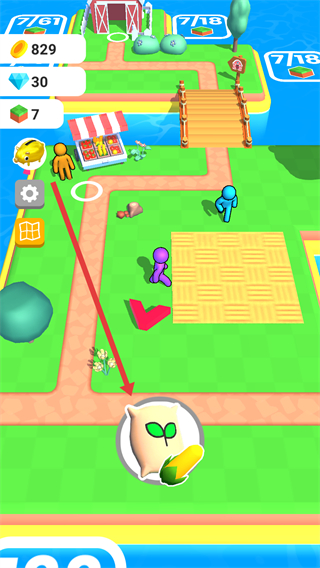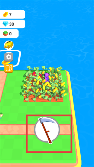 4、农作物成熟后,使用镰刀道具收割,获取农作物资源,积累资源可用于扩大农场规模和解锁新作物。
