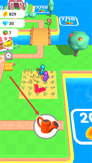 3、在农田旁点击水壶道具,对作物进行浇水。