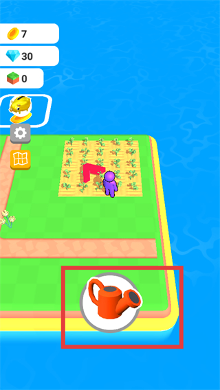 3、种植后使用浇水壶道具为农作物浇水,促进其生长,确保每块农田的作物都能得到充足水分。