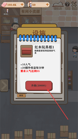 2、进入【设施】界面,查看红木玩具柜的升级条件,满足后消耗金币点击【升级】。