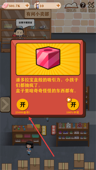 4、点击【潘多拉盒】图标,消耗金币选择【开】,可抽取各类物品,丰富小卖部的经营资源。