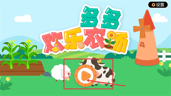 1、界面显示【多多欢乐农场】标识,点击标注的播放按钮进入游戏,开启农场的动物互动关卡,推进游戏流程。
