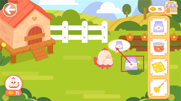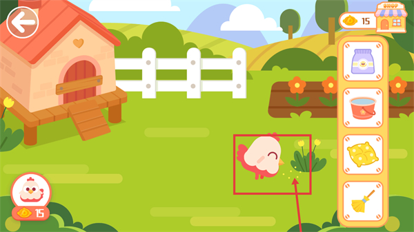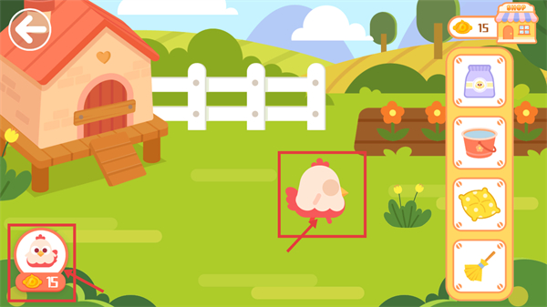 2、进入农场场景后,看到标注的小鸡,左侧显示【15】金币,右侧是道具栏,准备选取道具与小鸡展开互动。
