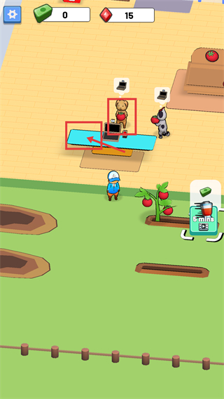 3、操控角色将收集的番茄运送至蓝色工作台,由小熊角色接收处理,推进当前环节的任务进度。