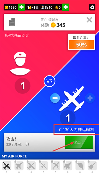 3、在领城市环节,使用【C-130大力神运输机】作战,当前【取胜几率-50%】,点击【攻击!】按钮发起对战,争夺城市奖励。