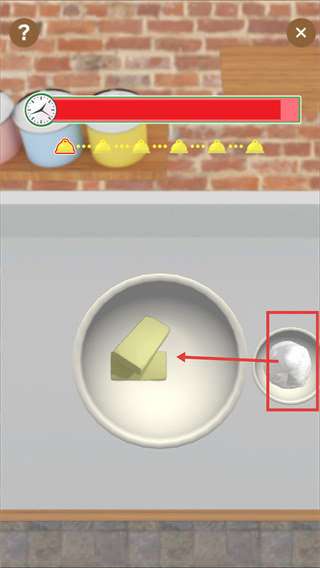 1、进入料理制作环节,留意顶部【时间条】,点击红框内的【材料】,将其操作至容器内的黄油旁,推进该步骤的制作流程。