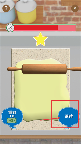 2、完成面团擀制后,看到界面的【星星】标识,点击红框内的【继续】按钮,推进到下一个料理步骤。
