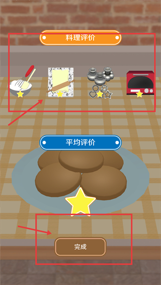 4、看到【料理评价】界面及工具评分后,点击红框内的【完成】按钮,结束本次料理制作流程,确认最终的制作结果。