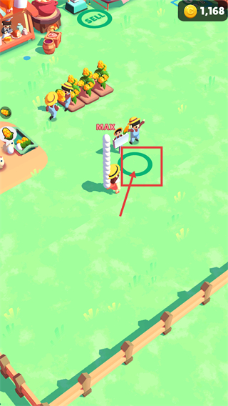 1、界面显示金币【1168】与【MAX】标识,点击标注的区域,触发对应操作,助力调配工人,推进农场的资源生产流程。