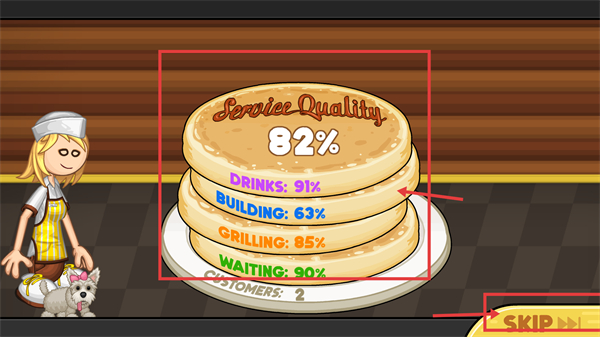 4、完成服务后会显示【Service-Quality】等数据,可查看各项目评分,也能点击【SKIP】跳过结算流程。