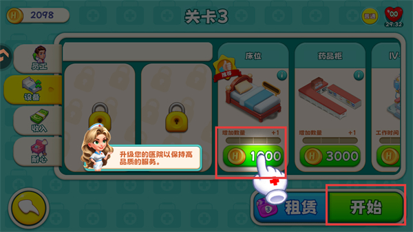 2、在游戏界面,按指引消耗金币增加【床位】数量,完成部署后点击【开始】按钮启动当前关卡的诊疗流程。