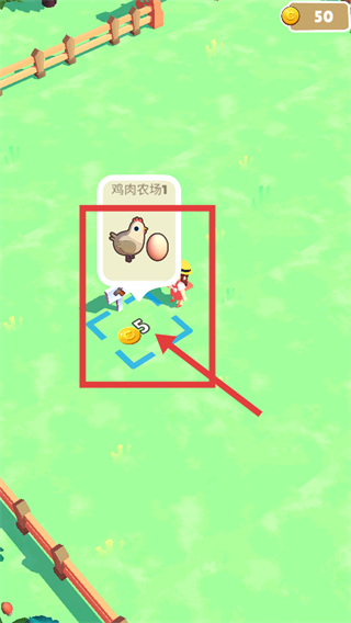 1、界面显示【鸡肉农场1】,点击标注区域消耗【5】金币(初始【50】),运营该农场以获取鸡肉相关资源,推进农场发展流程。