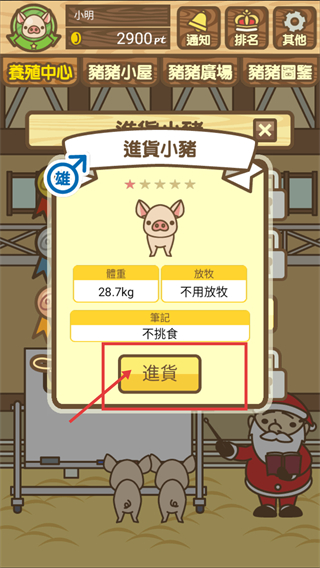 2、在【進貨小豬】界面,查看小猪的【28.7kg】等信息后,点击红框内的【進貨】按钮,完成该小猪的进货流程。