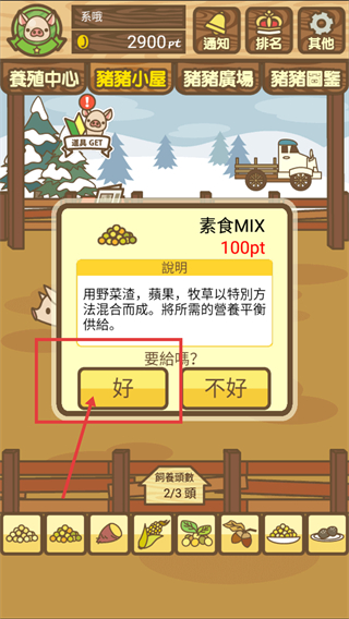 3、看到【素食MIX-100pt】的饲料说明后,点击红框标注的【好】按钮,消耗对应pt获取该饲料,为养猪准备食材。