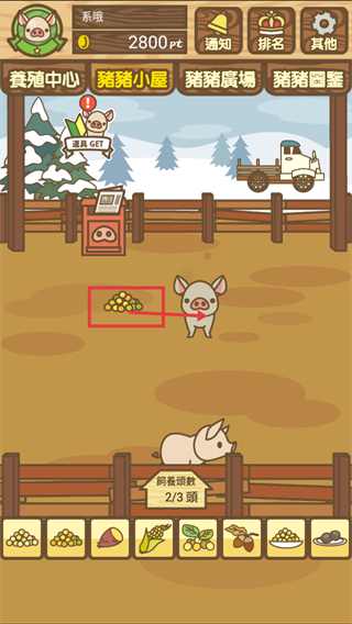 4、定位红框内的饲料堆,将其对应移动到小猪所在区域,完成此次喂食操作,推进养猪的成长流程。