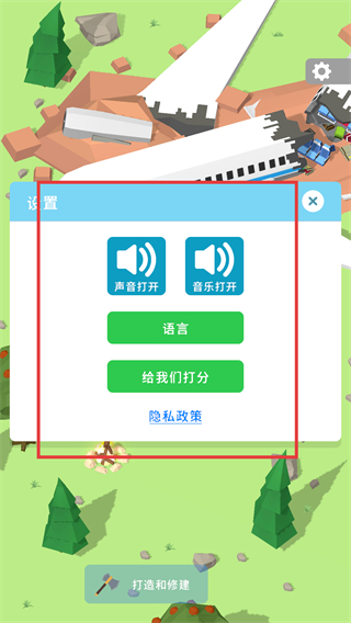 1、在设置界面,可调整声音(如开启或关闭声音、音乐)、选择语言和查看隐私政策,优化游戏体验。